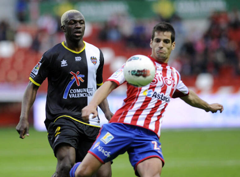 Victoria en El Molinón del Sporting ante el Levante en el encuentro correspondiente a la jornada 33 de la Liga BBVA. Empezó avisando el Sporting en el minuto 3 en un disparo cruzado de De las Cuevas que se fuera por muy poco. En el minuto 9, sale Munua bajo palos en una ocasión clara para Adrián Colunga. En el minuto 14 Trejo dispondría de una buena ocasión para adelantar al Sporting, pero sería el Levante, 2 minutos más tarde, quien por medio de Valdo cabecearia al fondo de la red un centro al área de Javi Venta. En el minuto 22, Trejo pondría el 1 a 1 en el marcador, en una jugada personal en la que marcaría de tiro raso a Munua. En el 25, De las Cuevas, disparó desde fuera del área, y el balón rozó el poste derecho de la portería levantina. Con el empate se llegaría al final de la primera mitad, aunque Barral, en el tiempo de descuento tuvo su oportunidad rematando de cabeza muy cerca de la escuadra defendida por Munua.
